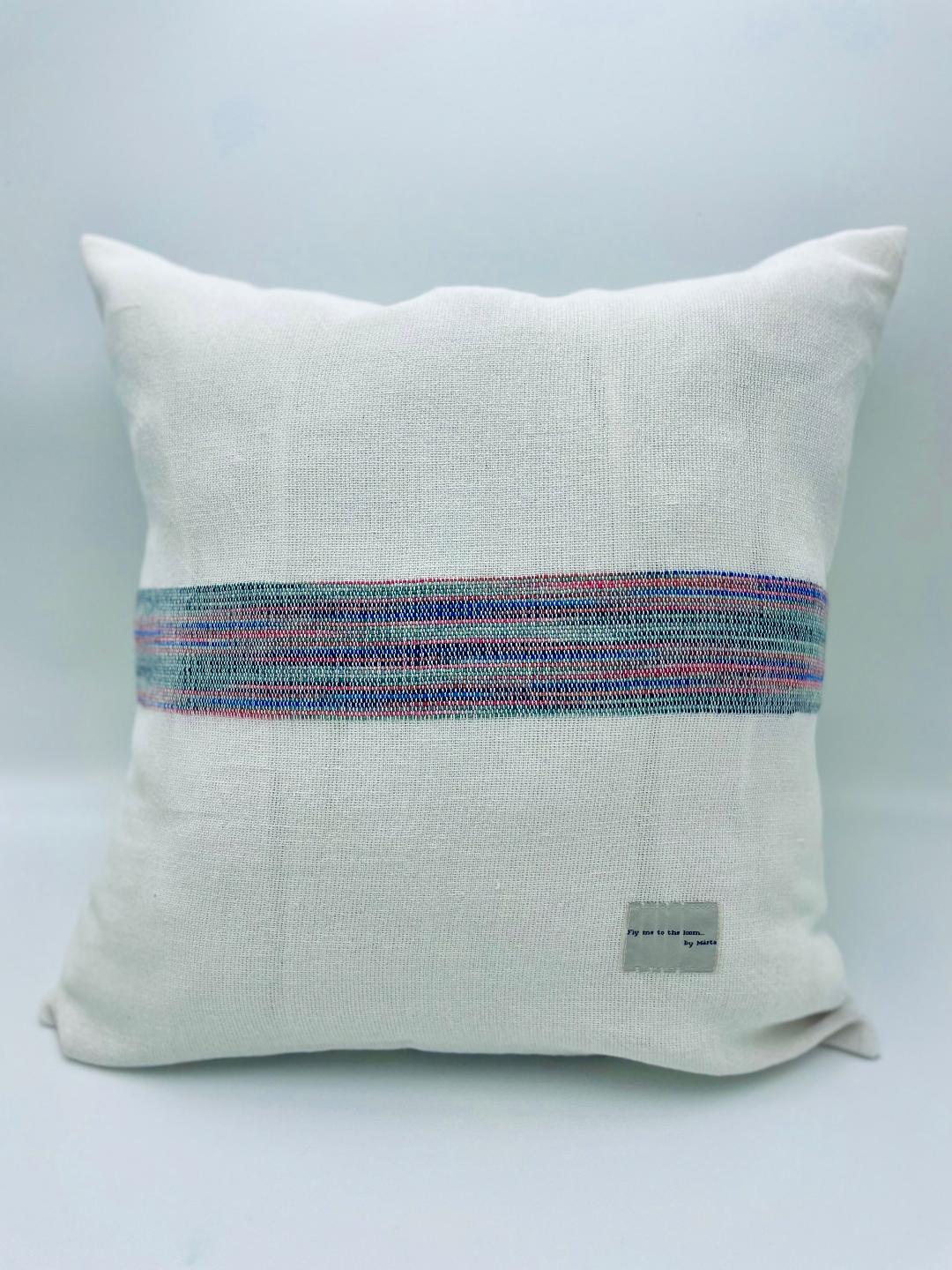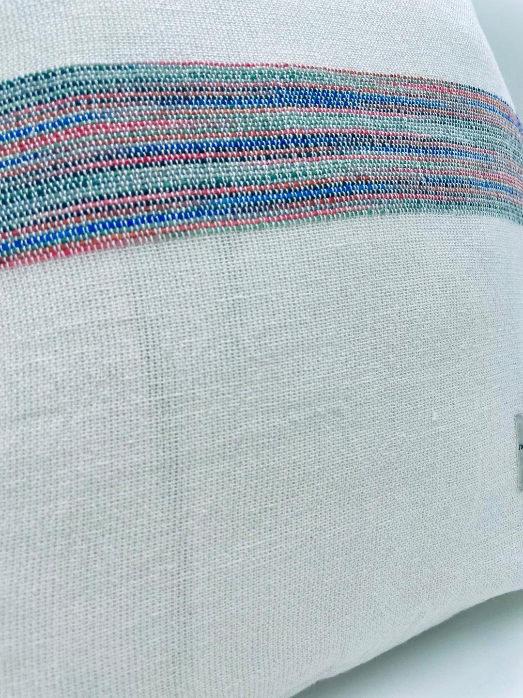 Kézzel szőtt, homokszínű lenvászon díszpárnahuzat színes merino gyapjú sávval.