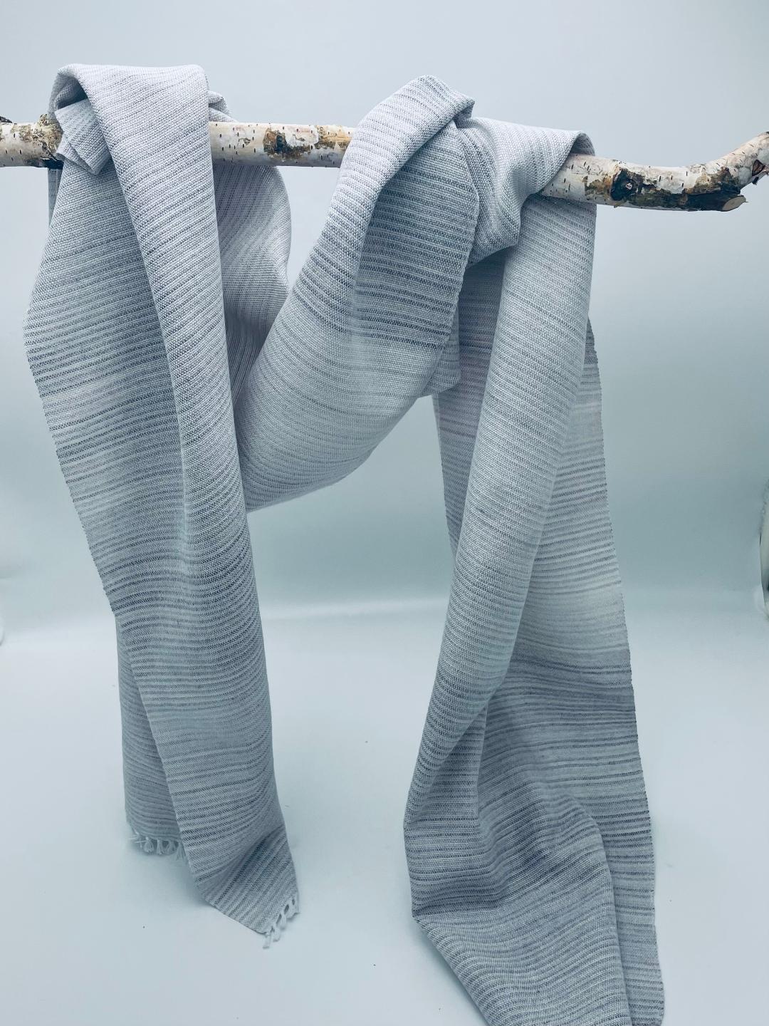 Ez az extra hosszú, kézzel szőtt sál finom merinó gyapjú és selyem keverékéből készült. A lágy szürke és fehér árnyalatok harmonikus átmenete minden öltözékhez illik. A merinó gyapjú természetes melege és a selyem finom fénye tökéletes összhangban biztosítanak kényelmet és kifinomultságot.