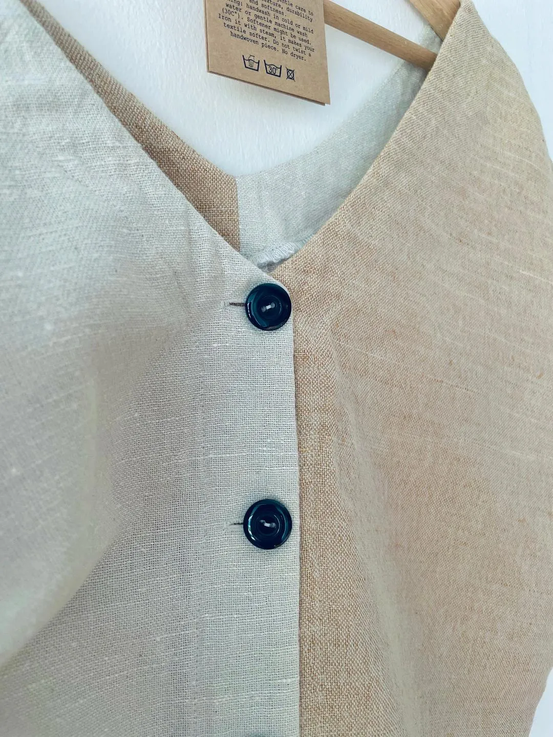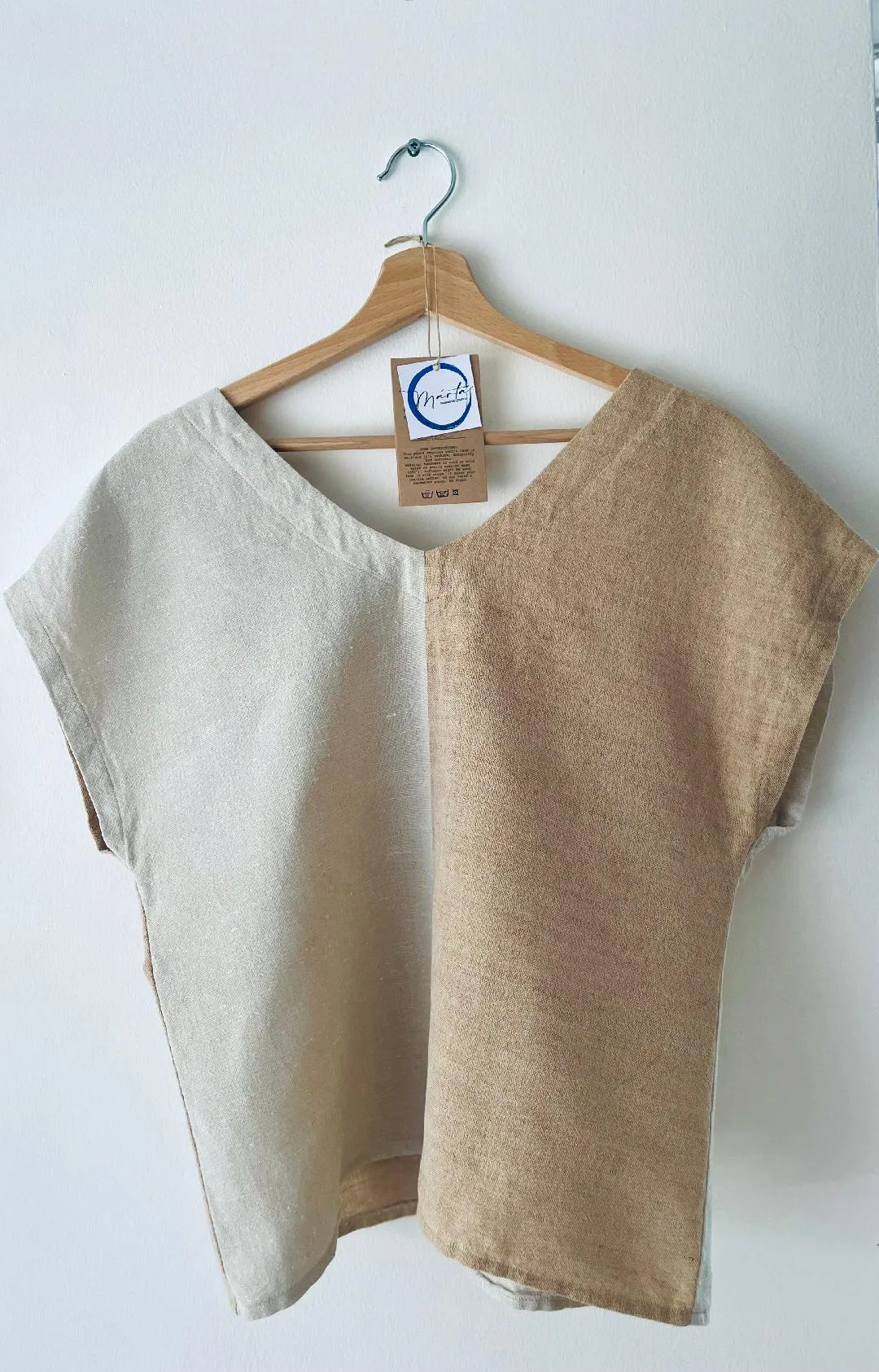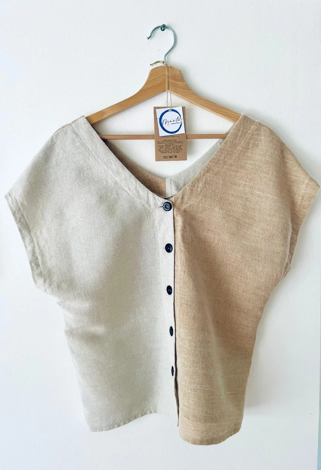 Bohém báj, időtlen eleganciával. Ez a kézzel szőtt, lenvászon blúz aszimmetrikus színeivel, extravagáns szabásával és bájos hátsó gombjaival igazán egyedi darab.